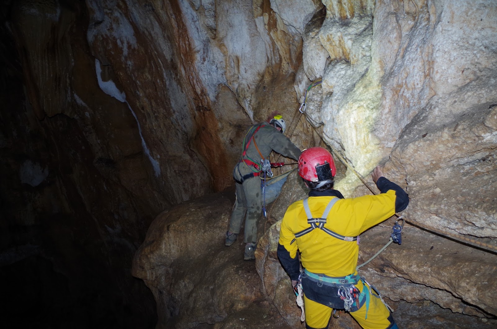 Une fois le ventre des valeureux spéléos bien remplis, direction la lumière du jour. Même si les premiers mouvements sont hésitants, nos deux nouvelles recrues prennent vite le coup. Seul petit incident de parcours, un blocage de croll par la sangle du harnais de torse, pour tout les deux et au même fractio, fallait le faire!